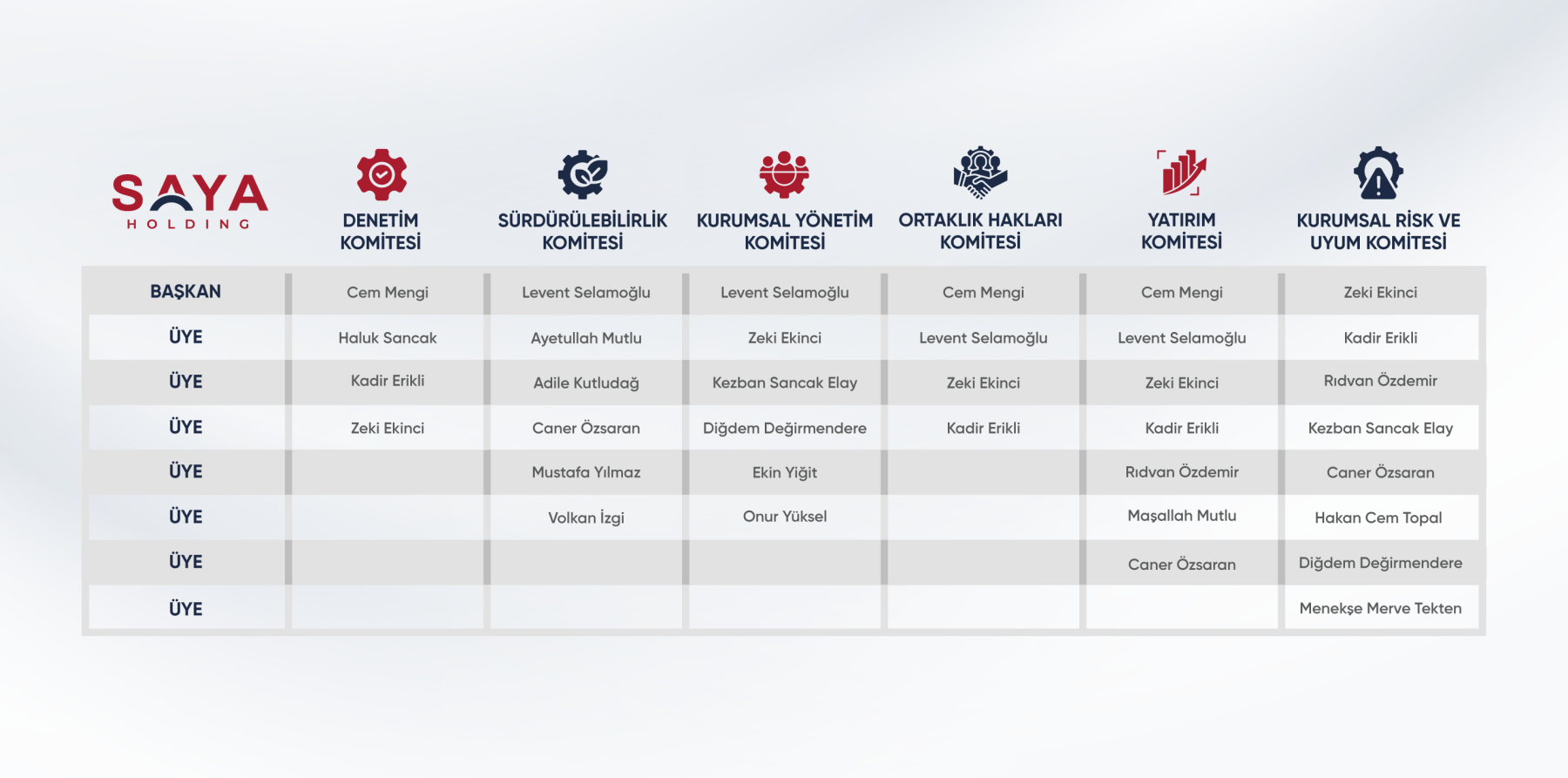 Kurumsal Risk Ve Uyum Komitesi: Saya Holding ve İştirakleri’nde risk yönetimi politika ve stratejilerinin geliştirilmesini sağlayan, kurumsal hedeflerin gerçekleştirilmesine engel olabilecek risklerin erken tespit edilmesi, yönetilmesi, bertaraf edilmesi ve oluşabilecek fırsatları da tespit ederek çalışmalara dahil edilmesini amaçlayan, iştiraklerde oluşturulan çalışma grupları tarafından tanımlanan mevcut ve olası risk unsurlarını Kurumsal Risk Yönetimi sistematiği çerçevesinde değerlendirerek izleyen ve ilgili risklerin yönetilmesine ilişkin analiz ve çalışmaları gerçekleştirerek öneri ve tavsiyelerini Saya Holding ve İştirakleri’nin Üst Yönetim ve Yönetim Kurulları’na sunmakla görevlendirilmiş olan, COSO Kurumsal Risk Yönetimi standartları doğrultusunda yapılanmış komitedir.