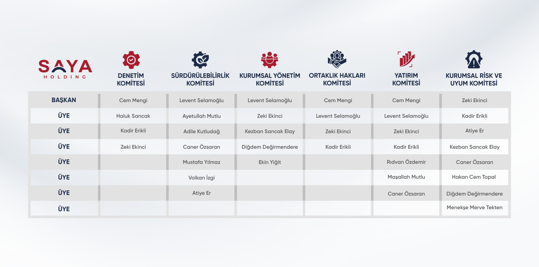 Denetim Komitesi: Saya Holding ve iştiraklerinde gerçekleştirilen iç denetim ve iç kontrol faaliyetleri ile düzenlenen denetim raporlarını inceleyerek değerlendiren; raporlarda yer alan uyarı ve önerilerin uygulamaya konulup konulmadığını takip eden, iç kontrol ve iç denetim sisteminin işleyişinin etkinliği ile bağımsız denetim sürecinin gözetimini yapan, tüm bu hususlarla ilgili Yönetim Kurulu’na bilgi veren komitedir.